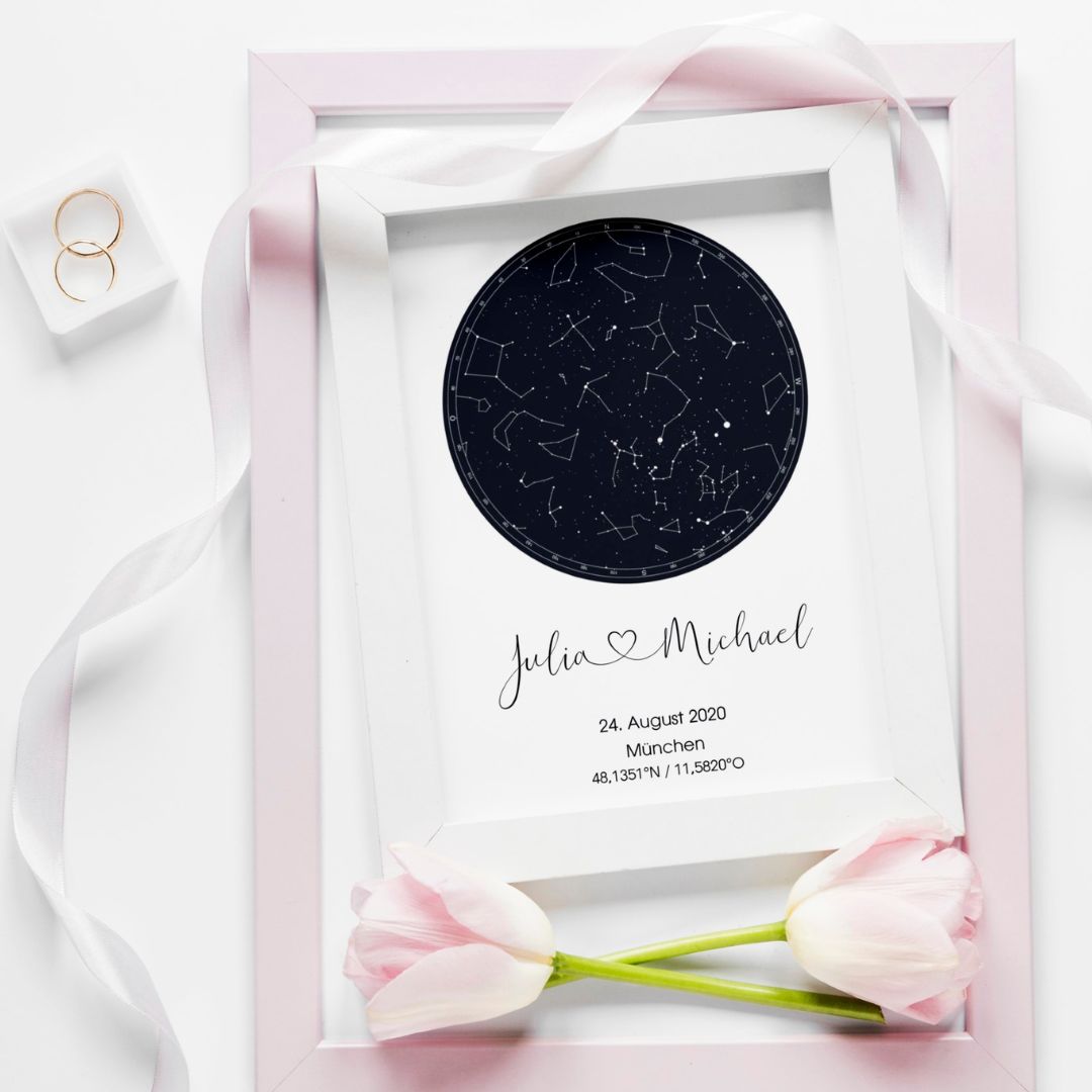Halten Sie den Moment in einem Bild fest. Die personalisierte Sternenkarte bewahrt die Uhrzeit, Minute und den Ort und verwandelt diese in ein schönes Wandbild, das in jedem Zuhause perfekt zur Geltung kommt. Ob das Datum in der Vergangenheit oder Zukunft liegt, es ist ein ideales Geschenk zur Hochzeit, zum Geburtstag, zum Jubiläum oder zur Erinnerung an ein erstes Treffen oder den ersten Kuss.