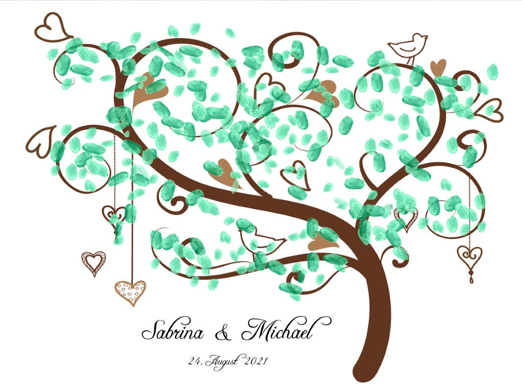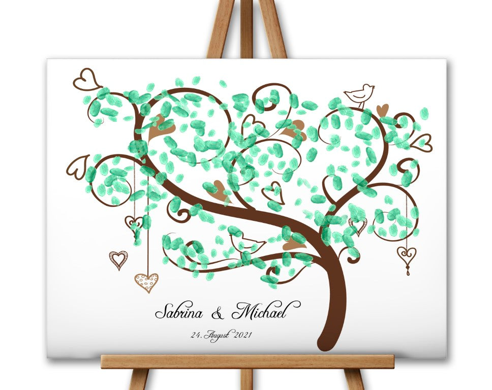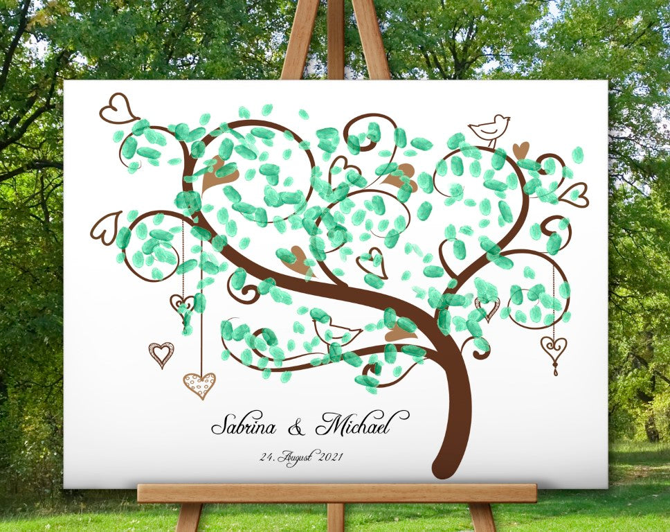 Hochzeitsgeschenk, Gästebuch, Gästebaum - Wunschbaum - Perfekte Alternative zu traditionellen Papieralben. Ein gemeinsames Hochzeitsspiel, bei dem die Gäste gemeinsam die Blätter des Baumes mit ihrem Fingerabdruck und ihrer Unterschrift gestalten.